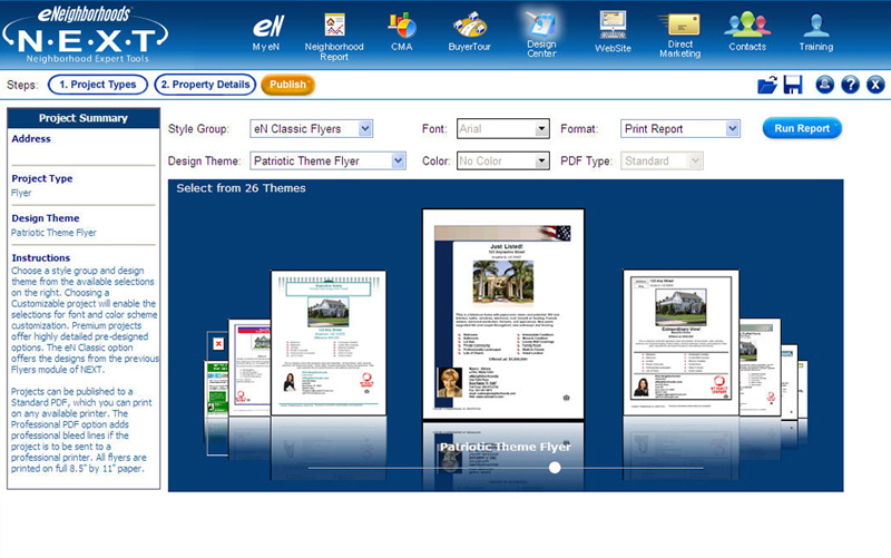 Design Center enables agents and brokers to quickly combine property information from their MLS with professional templates to produce real estate direct marketing materials that generate leads and drive sales. Best of all, Design Center is currently available as part of eNeighborhoods NEXT and complements eNeighborhoods CMA, BuyerTour, Neighborhood Envoy and e-mail marketing tools.